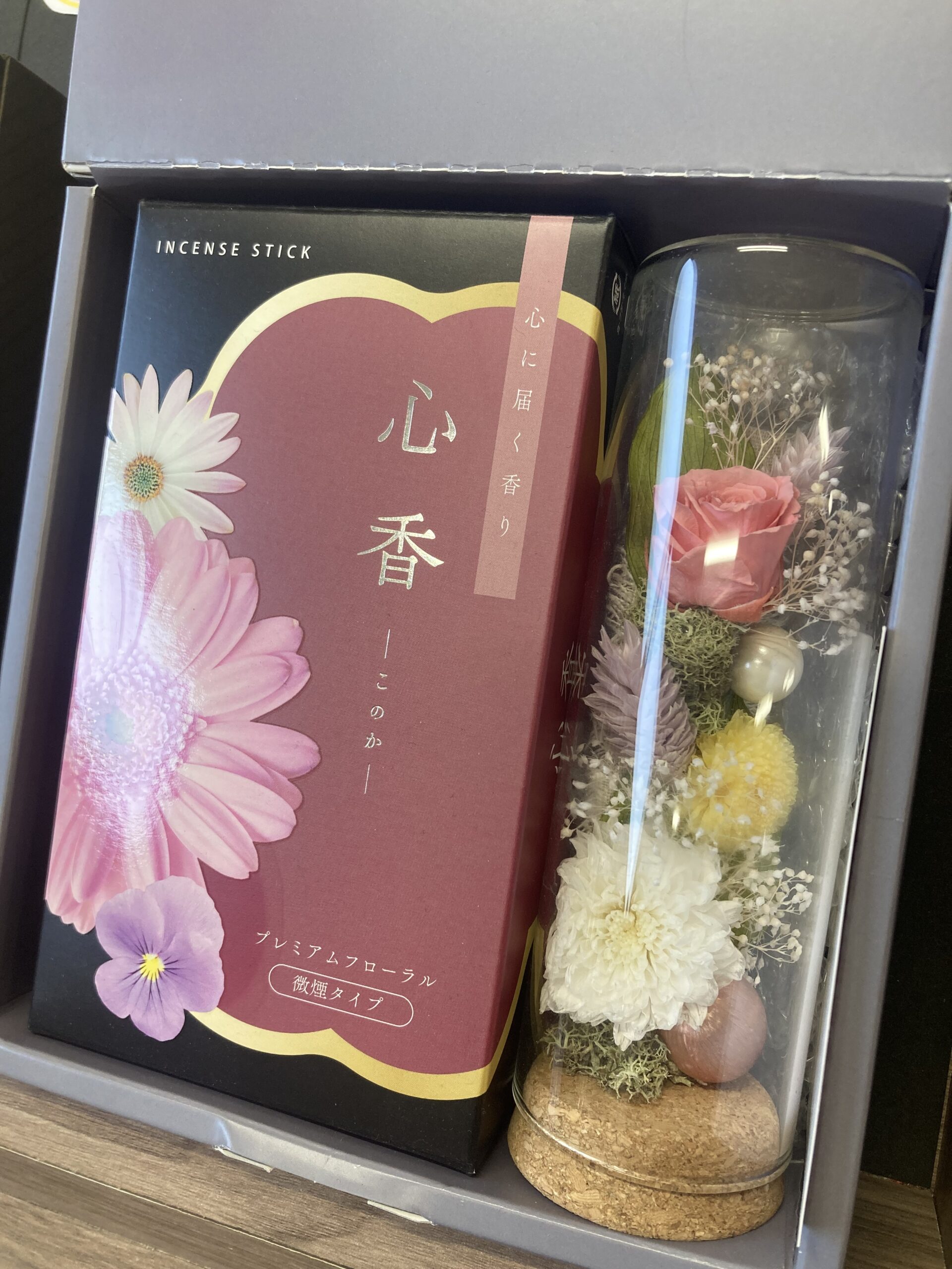 小さいお仏壇にも飾れるサイズのプリザーブドフラワーアレンジメントです。お線香はついていません。お好きなお線香を詰めていただけます。